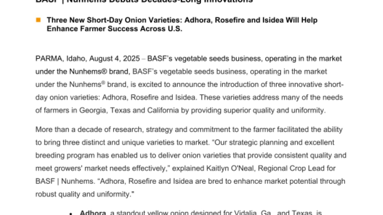 PARMA, IDAHO, August 4, 2025 – BASF’s vegetable seeds business, operating in the market under the Nunhems® brand, is excited to announce the introduction of three innovative short-day onion varieties: Adhora, Rosefire and Isidea. These varieties address many of the needs of farmers in Georgia, Texas and California by providing superior quality and uniformity.