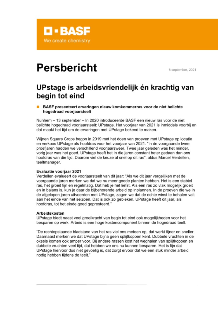 In 2020 introduceerde BASF een nieuw ras voor de niet belichte hogedraad voorjaarsteelt: UPstage. Het voorjaar van 2021 is inmiddels voorbij en dat maakt het tijd om de ervaringen met UPstage bekend te maken.