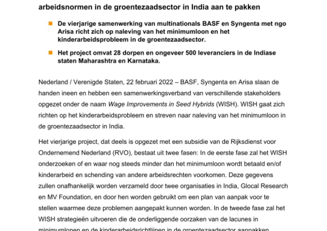 Nederland / Verenigde Staten, 22 februari 2022 – BASF, Syngenta en Arisa slaan de handen ineen en hebben een samenwerkingsverband van verschillende stakeholders opgezet onder de naam Wage Improvements in Seed Hybrids (WISH). WISH gaat zich richten op het kinderarbeidsprobleem en streven naar naleving van het minimumloon in de groentezaadsector in India.