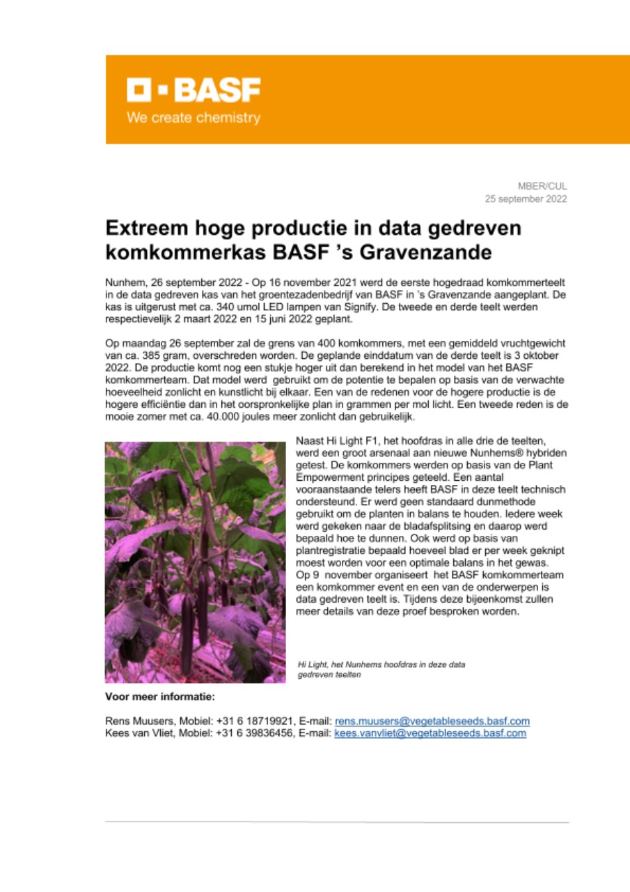 Op 16 november 2021 werd de eerste hogedraad komkommerteelt in de data gedreven kas van het groentezadenbedrijf van BASF in ’s Gravenzande aangeplant. De kas is uitgerust met ca. 340 umol LED lampen van Signify. De tweede en derde teelt werden respectievelijk 2 maart 2022 en 15 juni 2022 geplant.