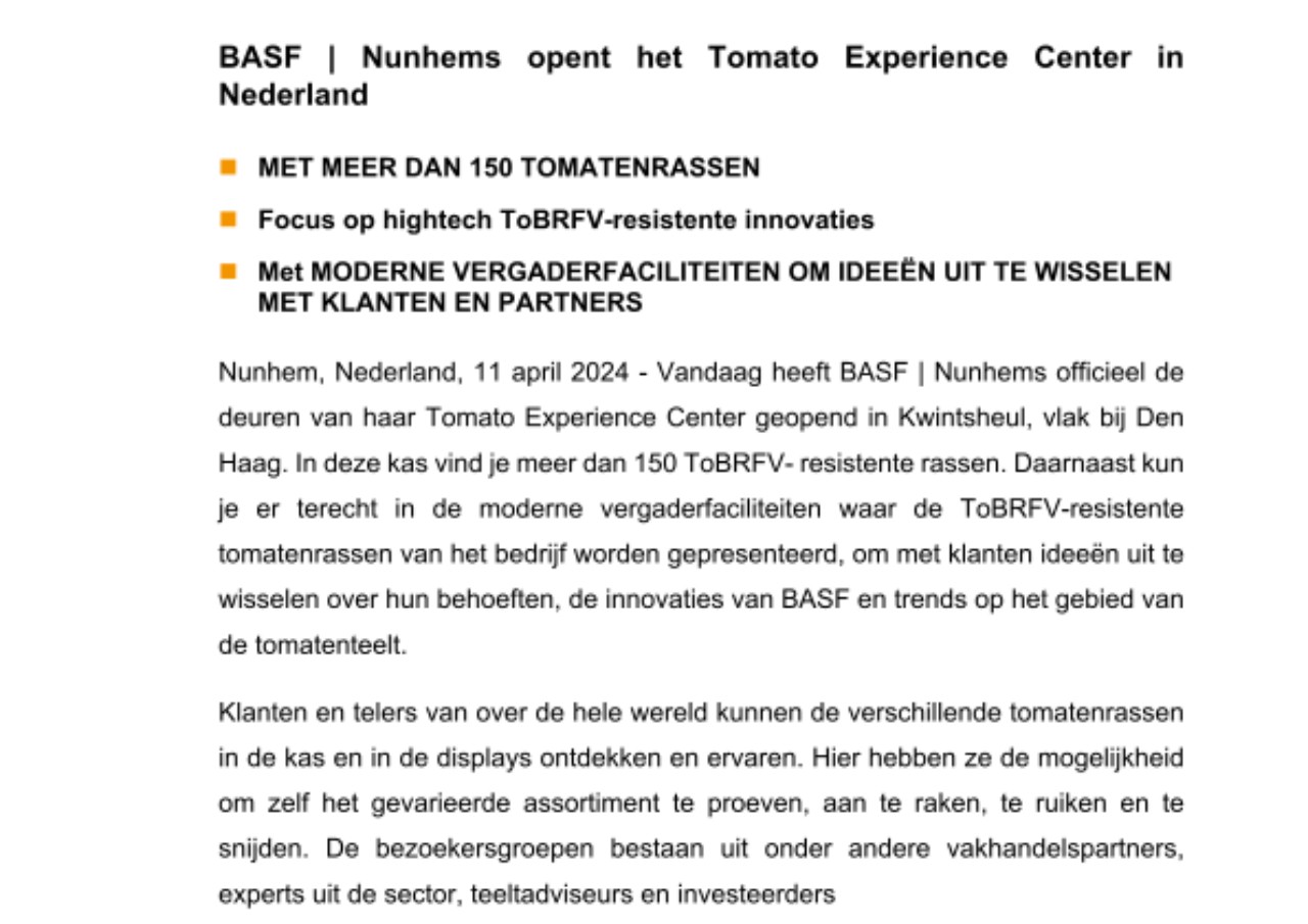 Nunhem, Nederland, 11 april 2024 - Vandaag heeft BASF | Nunhems officieel de deuren van haar Tomato Experience Center geopend in Kwintsheul, vlak bij Den Haag. In deze kas vind je meer dan 150 ToBRFV- resistente rassen. Daarnaast kun je er terecht in de moderne vergaderfaciliteiten waar de ToBRFV-resistente tomatenrassen van het bedrijf worden gepresenteerd, om met klanten ideeën uit te wisselen over hun behoeften, de innovaties van BASF en trends op het gebied van de tomatenteelt.