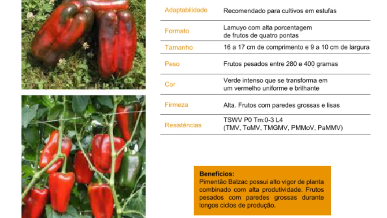 O Pimentão Balzac possui alto vigor de planta combinado com alta produtividade. Frutos pesados com paredes grossas durante longos ciclos de produção.