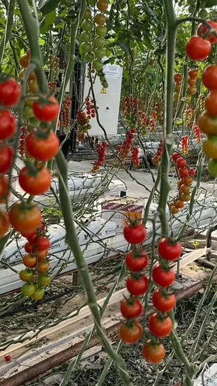 O controle da umidade relativa do ar dentro das estufas também é essencial, pois os tomates podem rachar facilmente caso o ambiente se desregule. Essa variação térmica é sentida na prática: uma manhã de 15°C rapidamente se transforma em um calor abafado de 22°C dentro da estrutura.