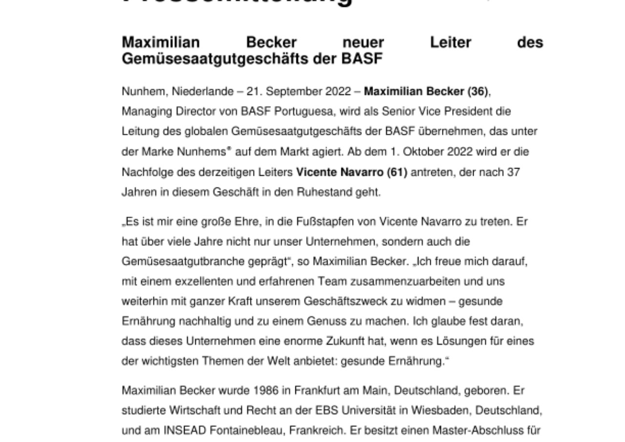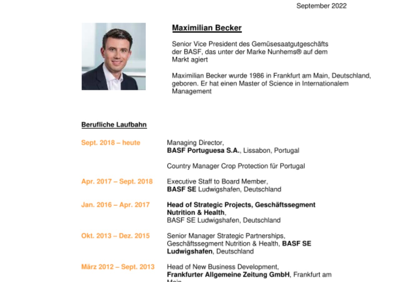 Maximilian Becker (36), Managing Director von BASF Portuguesa, wird als Senior Vice President die Leitung des globalen Gemüsesaatgutgeschäfts der BASF übernehmen, das unter der Marke Nunhems® auf dem Markt agiert. Ab dem 1. Oktober 2022 wird er die Nachfolge des derzeitigen Leiters Vicente Navarro (61) antreten, der nach 37 Jahren in diesem Geschäft in den Ruhestand geht.
