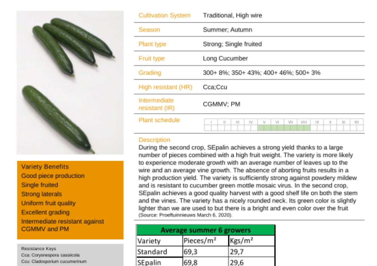 Trials conducted by the Saxony State Office for the Environment, Agriculture, and Geology in Dresden-Pillnitz demonstrate that SEpalin results in excellent production with the security of intermediate resistances. As early as 2018, SEpalin scored the best in the summer crop trial with the most pieces and the highest production in kilograms. In the trial, a comparison was made between ten varieties. In relation to the average class 1 production, SEpalin produced 11% more kilograms and piece production. In addition, SEpalin also produced the heaviest stem cucumber of the entire trial. The crop grows very easily and SEpalin therefore produces a large number of vines. SEpalin is a variety with a high production potential which grows easily (even under more extreme conditions) and which offers the security of intermediate resistance to powdery mildew and cucumber green mottle mosaic virus. (Source: Gurken im Sommeranbau auf Substrat https://www.hortigate.de/bericht?nr=78693)