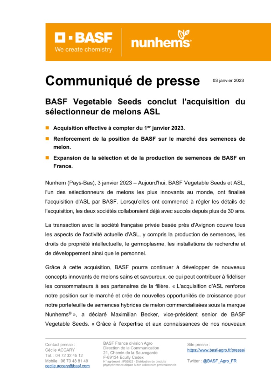 ASL est spécialisée dans les melons à chair orange, comme le Cantaloup et le Charentais, dont les variétés à succès Magenta, Red Falcon, Torum, Bernini et Golden Cantaloup, couvrant les principaux marchés du monde. Les installations de production et de sélection de semences près d’Avignon seront désormais intégrées au réseau existant de BASF, qui compte 23 stations de sélection de semences potagères dans le monde, créant ainsi le premier site de R&D pour la sélection et le criblage en France.