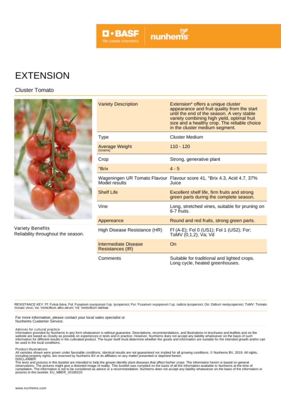 | Extension F1 | Cluster Middle | 110-120 g | Strong, generative | ✓ | ✓ | HR | HR (0-2) | HR (0-1) | HR | HR | HR | IR | |