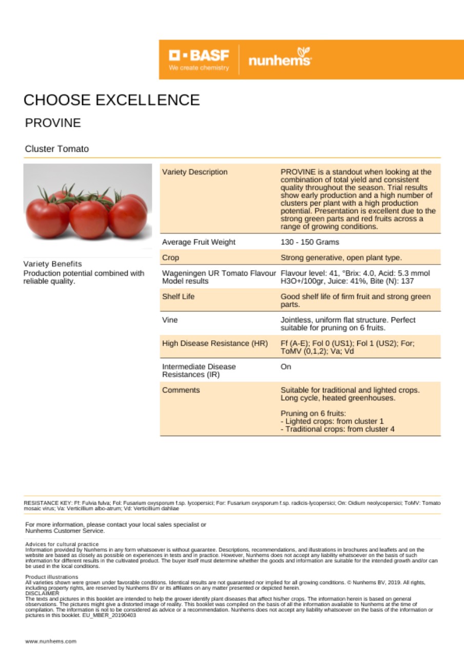 | Provine F1 | Cluster big | 130-150 g | Strong, generative, open | ✓ | ✓ | HR | HR (0-2) | HR (0-1) | HR | HR | HR | IR | |