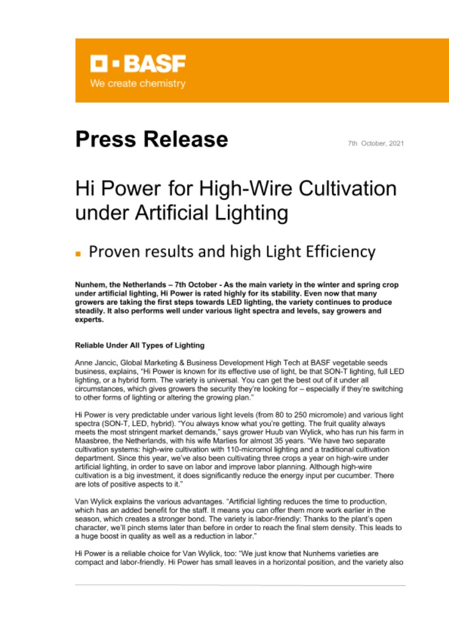 Anne Jancic, Global Marketing & Business Development High Tech at BASF vegetable seeds business, explains, “Hi Power is known for its effective use of light, be that SON-T lighting, full LED lighting, or a hybrid form. The variety is universal. You can get the best out of it under all circumstances, which gives growers the security they’re looking for – especially if they’re switching to other forms of lighting or altering the growing plan.”