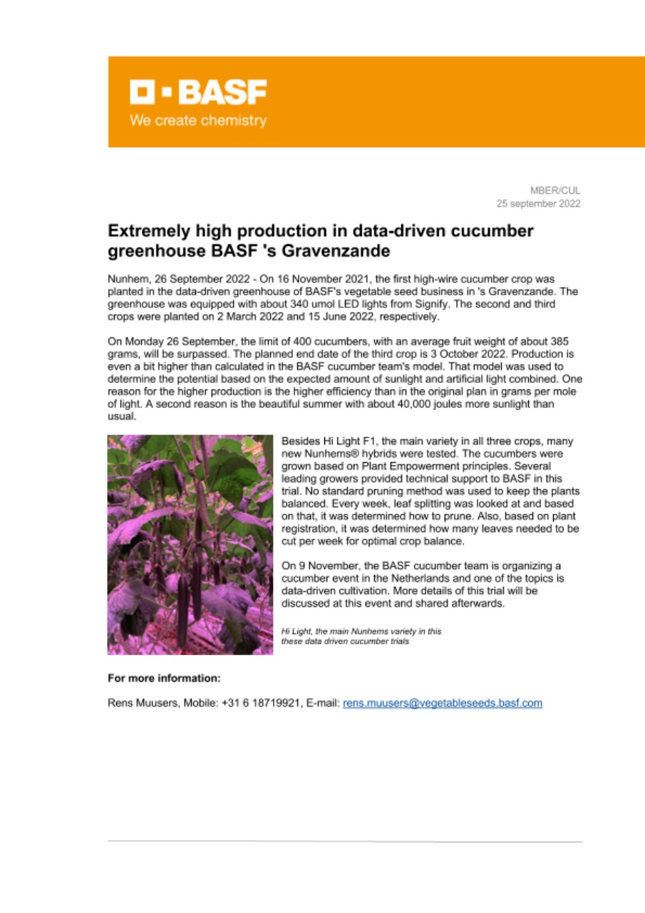On 16 November 2021, the first high-wire cucumber crop was planted in the data-driven greenhouse of BASF's vegetable seed business in 's Gravenzande. The greenhouse was equipped with about 340 umol LED lights from Signify. The second and third crops were planted on 2 March 2022 and 15 June 2022, respectively.