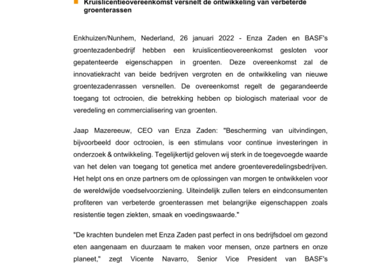 Enkhuizen/Nunhem, The Netherlands, January 25, 2022 -Enza Zaden and BASF’s vegetables seeds business have entered into a cross-license agreement for patented traits in vegetables. This agreement will increase the innovative power of both companies and speed up the development of new vegetable seeds varieties. The agreement regulates the guaranteed access to patents, covering biological material for vegetable breeding and commercialization.