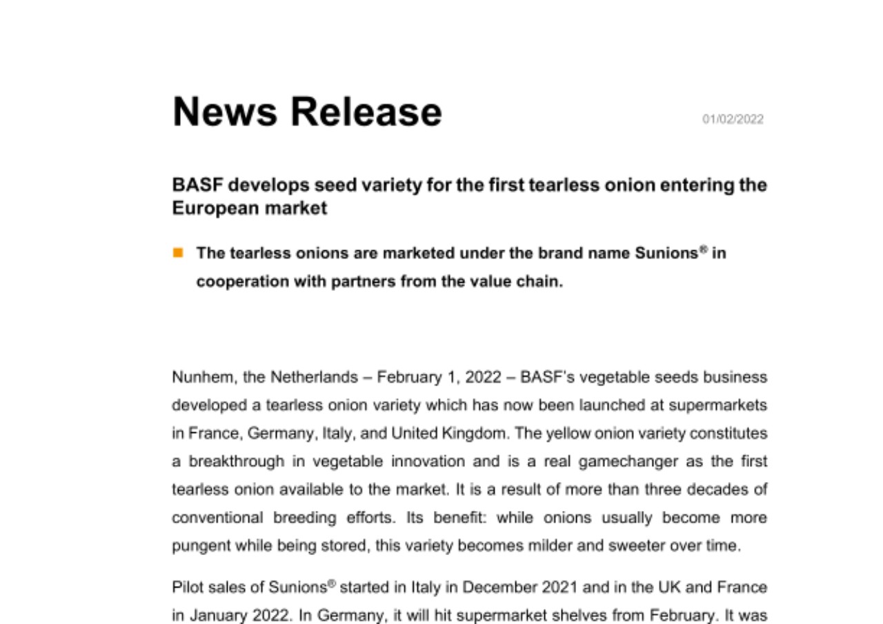 Nunhem, the Netherlands – February 1, 2022 – BASF’s vegetable seeds business developed a tearless onion variety which has now been launched at supermarkets in France, Germany, Italy, and United Kingdom. The yellow onion variety constitutes a breakthrough in vegetable innovation and is a real gamechanger as the first tearless onion available to the market. It is a result of more than three decades of conventional breeding efforts. Its benefit: while onions usually become more pungent while being stored, this variety becomes milder and sweeter over time.