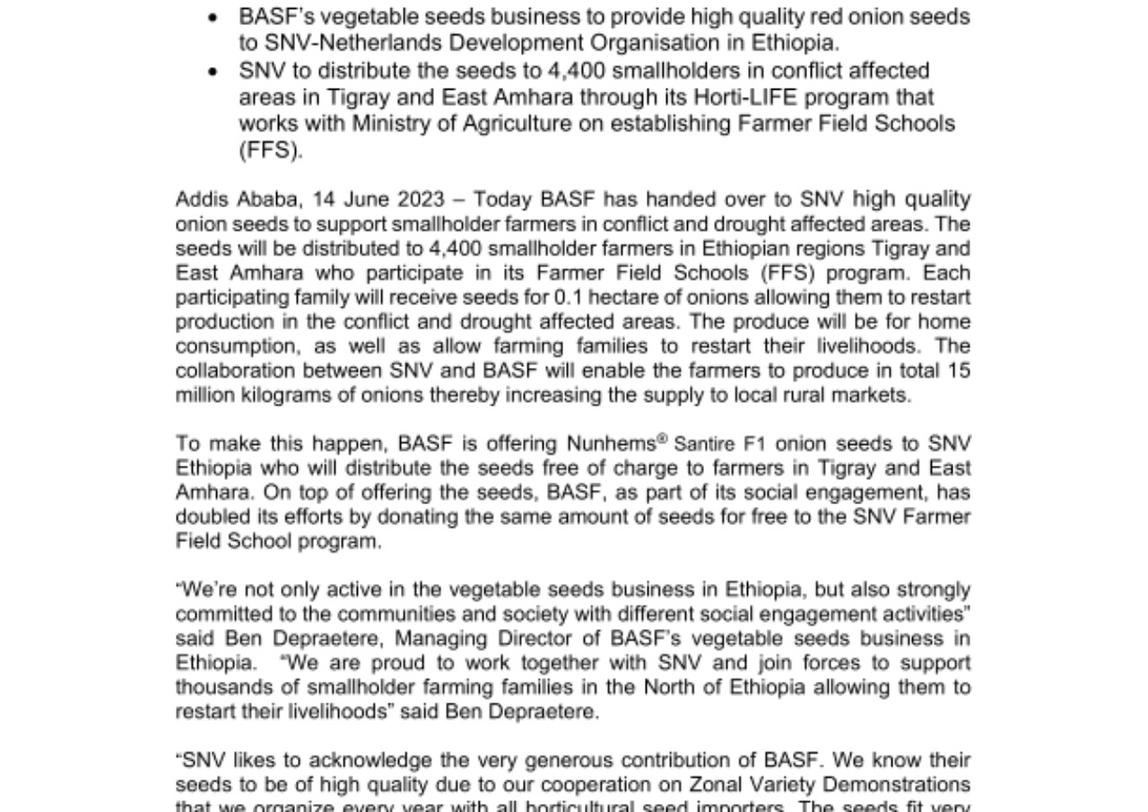 - BASF’s vegetable seeds business to provide high quality red onion seeds to SNV-Netherlands Development Organisation in Ethiopia.