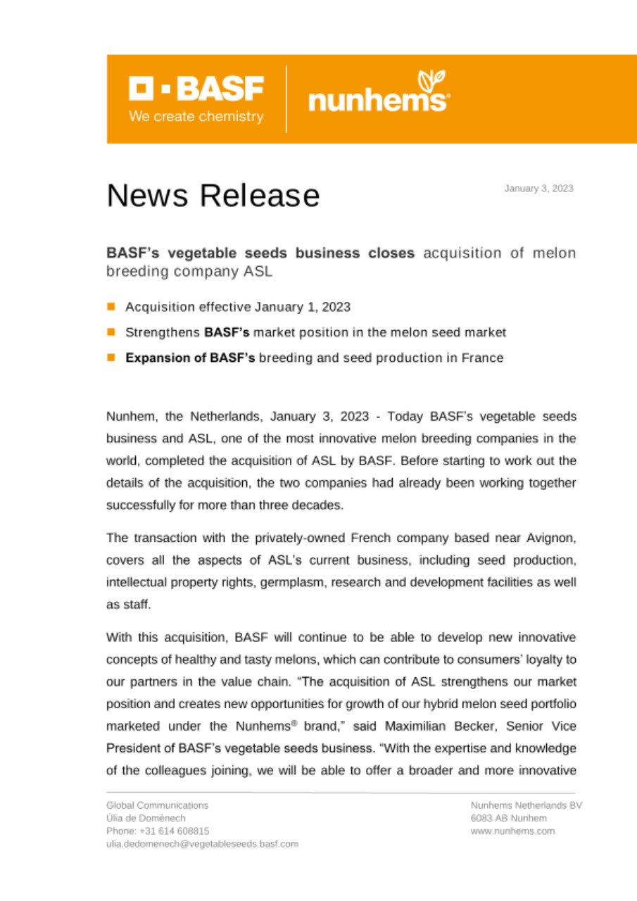 With this acquisition, BASF will continue to be able to develop new innovative concepts of healthy and tasty melons, which can contribute to consumers’ loyalty to our partners in the value chain. “The acquisition of ASL strengthens our market position and creates new opportunities for growth of our hybrid melon seed portfolio marketed under the Nunhems® brand,” said Maximilian Becker, Senior Vice President of BASF’s vegetable seeds business. “With the expertise and knowledge of the colleagues joining, we will be able to offer a broader and more innovative Page 2 January 3, 2023 melon pipeline to our value chain partners and consumers.”