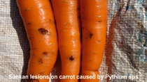 Cavity spot is characterized by elliptical to irregularly shaped depressed lesions oriented across the mature carrot taproots. Individual lesions are usually less than 0.5 inch (1.3 cm) in diameter. Infections occur anywhere along the taproot, but lesions tend to be more abundant on the upper third of the root and are often found where lateral roots emerge from the taproot. Lesions begin as pinpoint sunken spots and generally enlarge as roots mature.