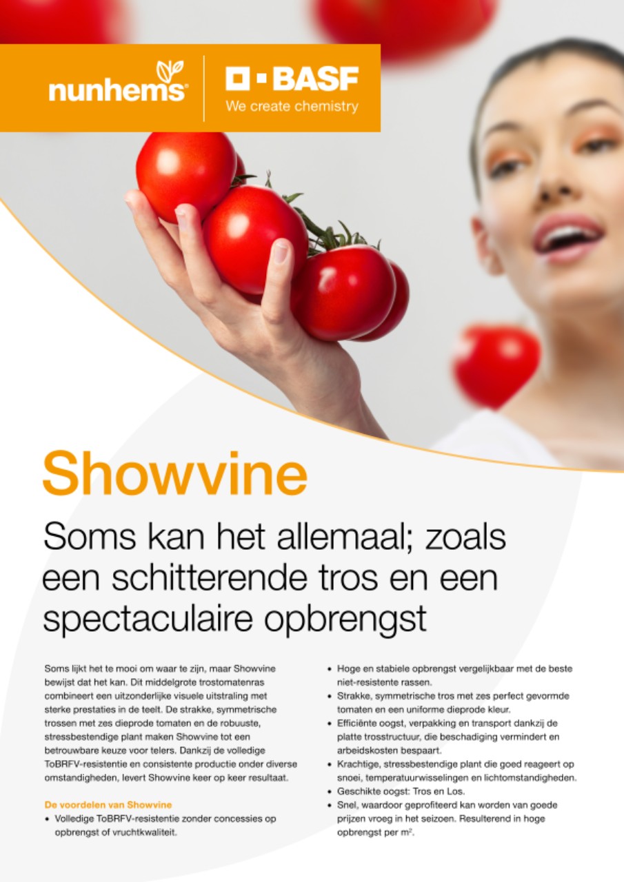 Met Showvine* introduceert Nunhems een nieuw trostomatenras dat écht het verschil maakt. Deze krachtige alleskunner combineert een indrukwekkende uitstraling met een opvallend hoge en stabiele productie. Telers krijgen een ras in handen dat niet alleen volledig ToBRFV-resistent is, maar ook qua vruchtkwaliteit en arbeidsefficiëntie meedraait in de top.