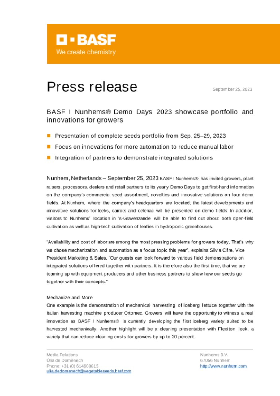 Nunhem, Netherlands – September 25, 2023 BASF I Nunhems® has invited growers, plant raisers, processors, dealers and retail partners to its yearly Demo Days to get first-hand information on the company’s commercial seed assortment, novelties and innovative solutions on four demo fields. At Nunhem, where the company’s headquarters are located, the latest developments and innovative solutions for leeks, carrots and celeriac will be presented on demo fields. In addition, visitors to Nunhems’ location in 's-Gravenzande will be able to find out about both open-field cultivation as well as high-tech cultivation of leafies in hydroponic greenhouses.