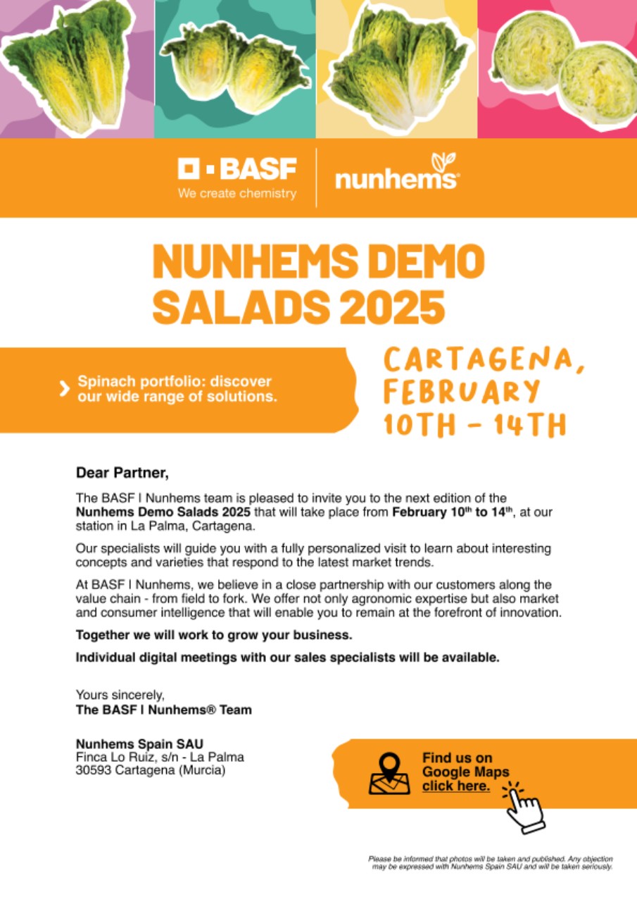 The BASF | Nunhems team is pleased to invite you to the next edition of the Nunhems Demo Salads 2025 that will take place from February 10th to 14th, at our station in La Palma, Cartagena.