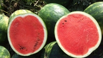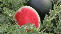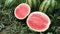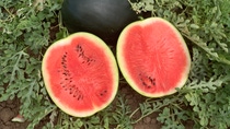 Плоды весом 🍉 8-10 кг имеют округлую форму, темную окраску коры. Мякоть насыщенного красного цвета, вкусная с высоким содержанием сахаров.