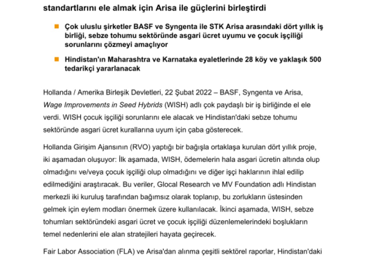 - Çok uluslu şirketler BASF ve Syngenta ile STK Arisa arasındaki dört yıllık iş birliği, sebze tohumu sektöründe asgari ücret uyumu ve çocuk işçiliği sorunlarını çözmeyi amaçlıyor