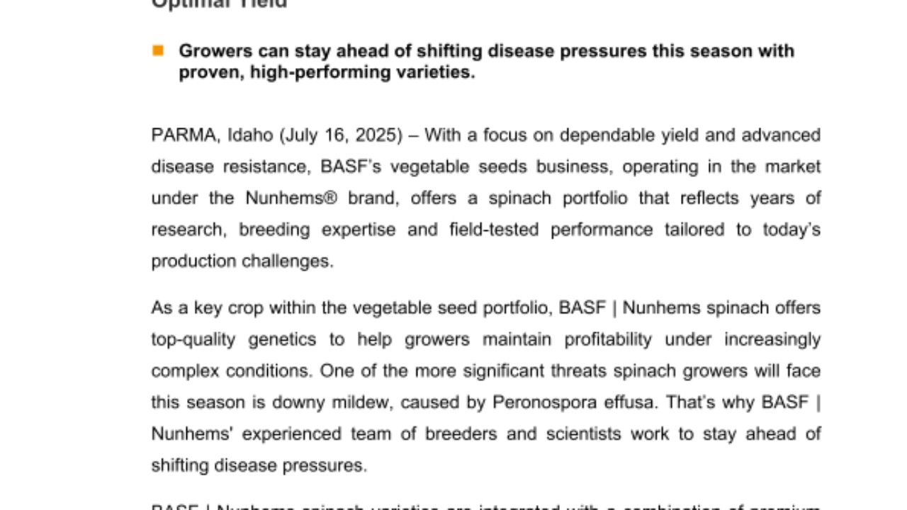 PARMA, Idaho (July 16, 2025) – With a focus on dependable yield and advanced disease resistance, BASF’s vegetable seeds business, operating in the market under the Nunhems® brand, offers a spinach portfolio that reflects years of research, breeding expertise and field-tested performance tailored to today’s production challenges.